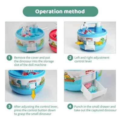 Bevor das Spiel beginnt, drehen und öffnen Sie bitte die transparente Abdeckung oben, legen Sie eine angemessene Menge Dinosaurier ein und bedecken Sie die Abdeckung, um das Spiel zu starten. Der mittlere Mechanismus kann den Greifarm nach links und rechts steuern, den linken Mechanismus drücken, um das Greifen oder Lösen des Greifarms zu steuern, und den rechten Mechanismus drücken, um das Anheben oder Senken des Greifarms zu steuern.